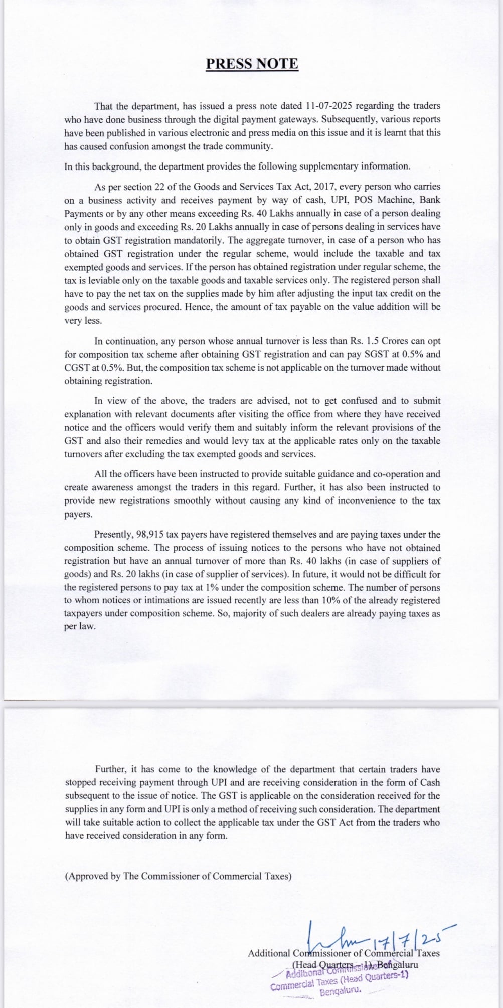 GST Applicable on consideration received in Any Form, be it cash or UPI: Karnataka CTD