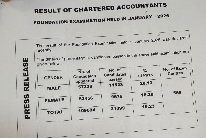 Similarly, for the CA Foundation January 2026 Examination, a total of 109,694 candidates appeared, among whom 21,099 candidates passed with a total pass percentage of 19.23%.