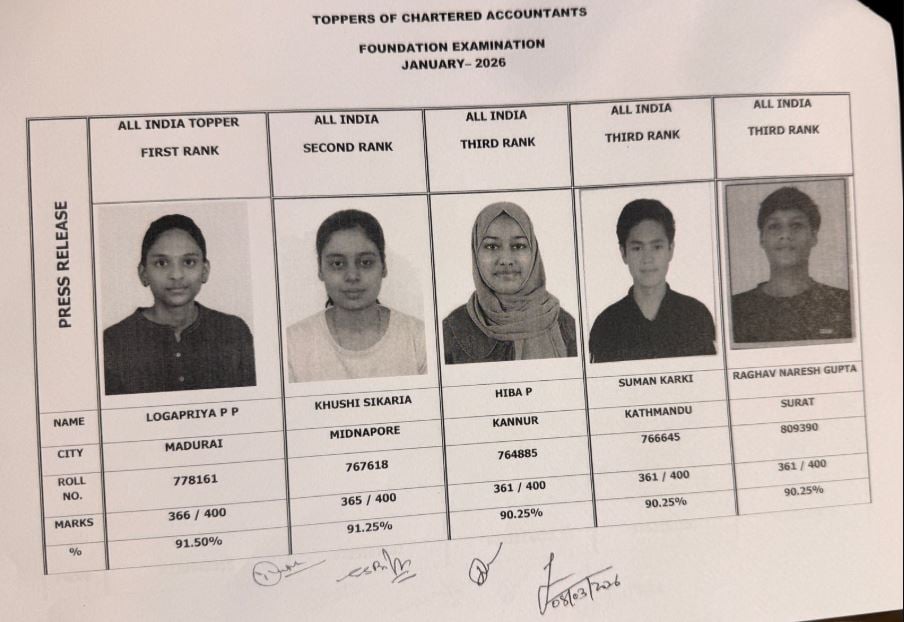 In the CA Foundation January 2026 Examination, Logapriya P.P. has secured AIR 1 – 366/400, and in the CA Intermediate January 2026 Examination, Kanhiya Lal has secured AIR 1 – 508/600.