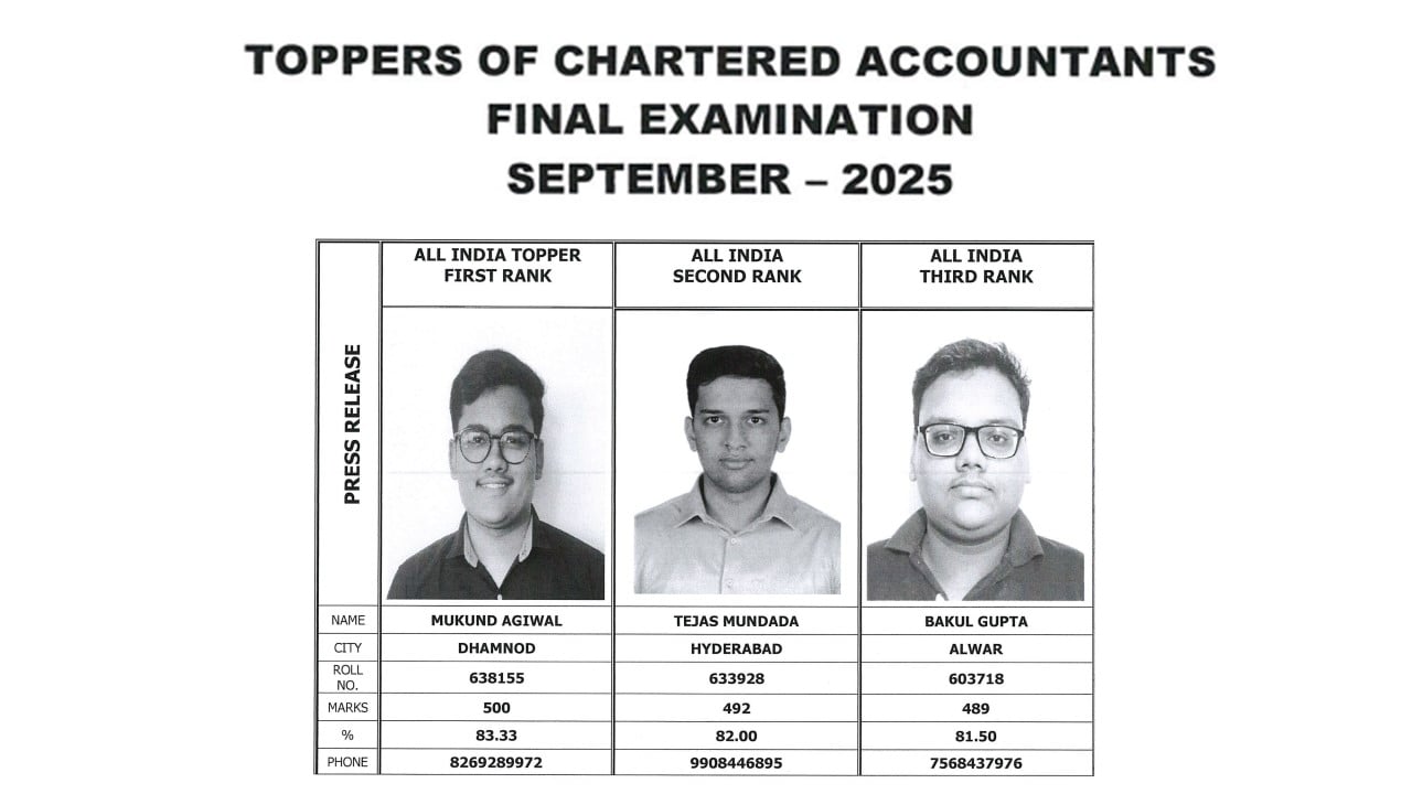 ICAI CA September 2025: The Examination Department of the Institute of Chartered Accountancy of India (ICAI) has officially announced the results and merit list for Chartered Accountants (CA) final September 2025 examinations, held on September 3, 6, and 8, 2025, for Group I and on September 10, 12, and 14, 2025, for Group II (In Punjab and Jammu, the Group I, Paper 1 exam was rescheduled from September 3 to September 24, 2025, due to heavy rain and flooding).